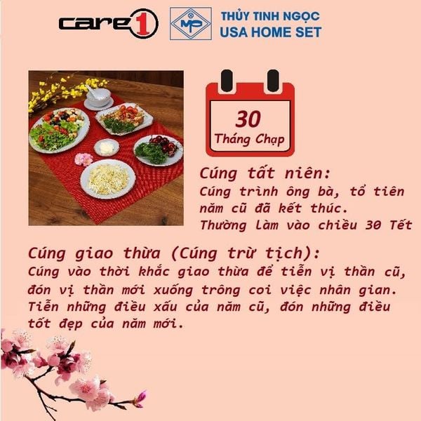 Chuẩn bị: Mâm cỗ Tất niên thường thịnh soạn nhất với đầy đủ các món: bánh chưng, xôi gấc, gà luộc, canh măng... Một bộ bàn ăn cao cấp từ Thủy Tinh Ngọc không chỉ giúp món ăn thêm đẹp mắt mà còn thể hiện sự chỉn chu, vẹn tròn chữ Hiếu của gia chủ.