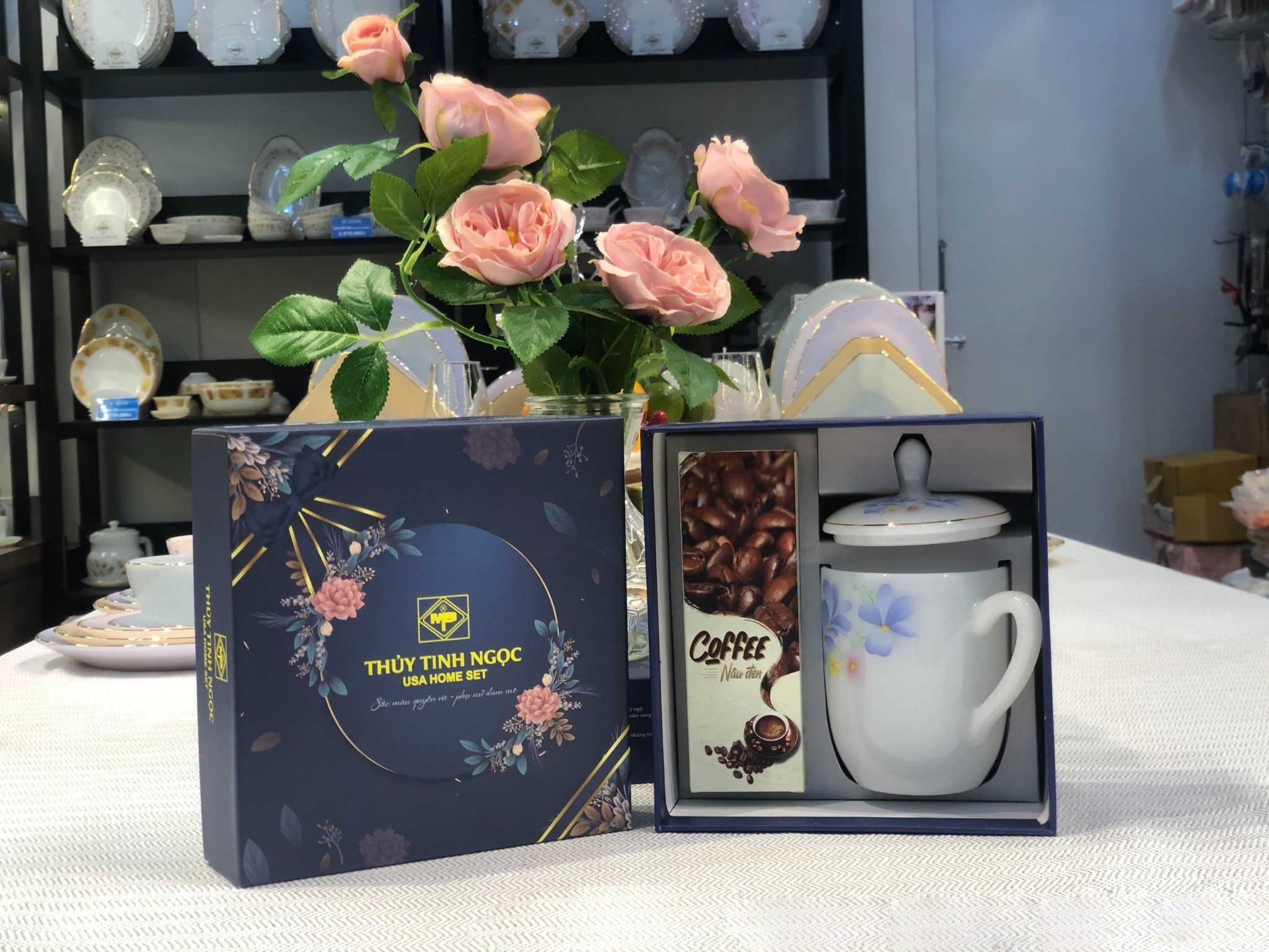 Bộ quà tặng ca trà kèm hộp trà + cafe hoa xanh